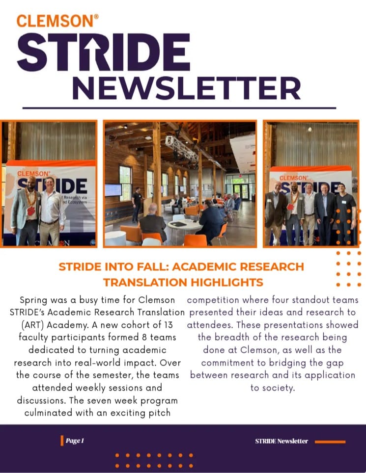 Clemson University- STRIDE’s ART Academy participant and one of four recent recipients of National Science Foundation (NSF) Seed Translational Research Project (STRP) grants in the news.